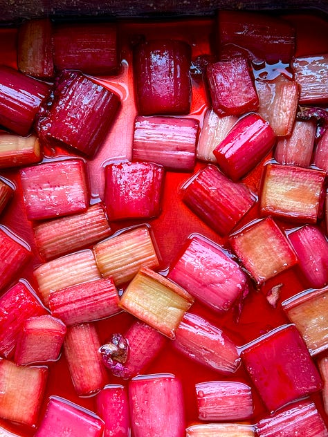 Place into preheated oven and bake for 15-20 minutes, gently stirring about halfway through. The rhubarb is done when the sugar is dissolved and the rhubarb is just fork tender but still holding its shape - if cooked too long, it will fall apart (and still be delicious, just more of a compote).
